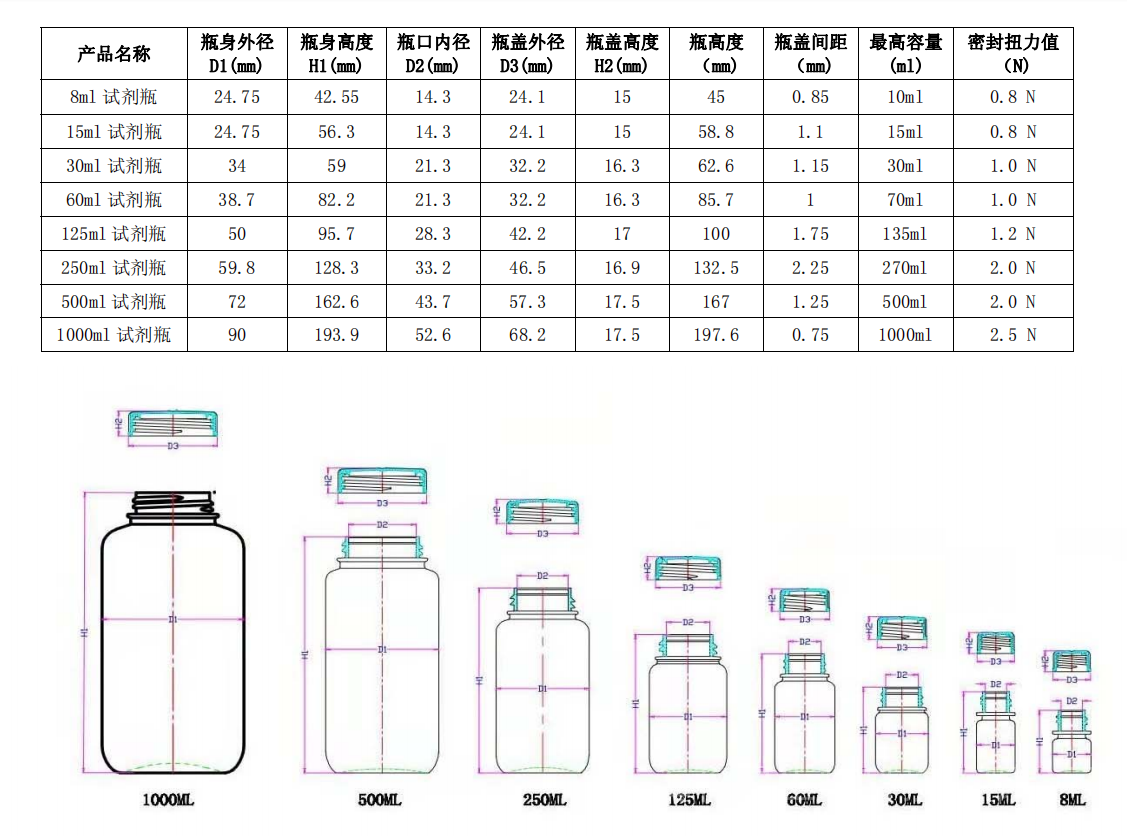 2、品种齐全,8ml、15ml,30ml,60ml,125ml,250ml,500ml,1000ml八个规格16个品种,满足不同规格包装及储存需求;有本白色和琥珀色可供选择,琥珀色塑料试剂瓶具有优良的遮光功能,可用于存储光敏感物质。